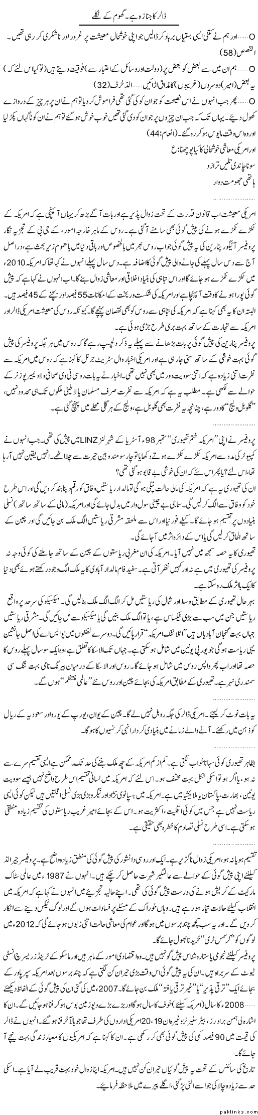 ^^ Kaisay Anti-Pakistani jal rahay haiN aisi reports per...agr kisi ko yaad ho tu aaj say 10 saal pehlay America kay ToTnay key baat kernay wala pagal samjha jata, but now it is very much possible.. her tarf say aisay hi articles aa rahay haiN.. Americi khud kisi had tak iss ka iqraar bhi ker rahay haiN, per Shah say zyada Shah kay wafadar, ko abhi tak yaqeen hi nahi aya... na aye...