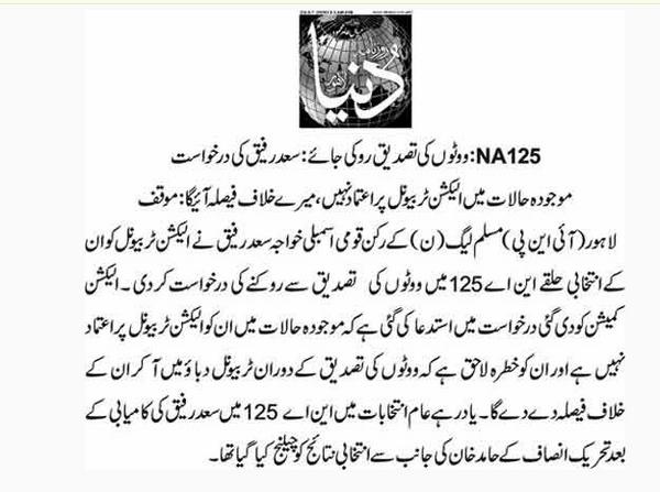 I heard there were strong news of rigging in this constituency so a recount must happen. Its fair for everyone. If Saad Rafique thinks he really won it then wuts he afraid of? Concerns about election tribunal is insane as He's in govt and thats the stand which normally opposition takes. Either way a recount should happen and if his votes come out less than his competitor then he must leave. Period.