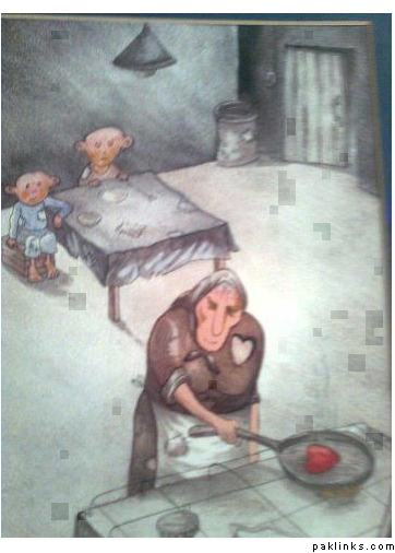 Look at the home, they have nothing, the kid look poor, this I presume is the mother who will give anything to make sure her children are okay, so she cooks her heart, but it shows that the mother would give anything, even if it was the biggest thing to her, her life for her children.