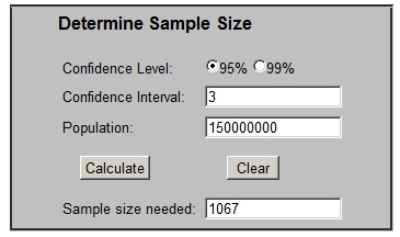 Re your question of 6.5 billion people, theres a simple answer. When a population belongs to a number of different categories as the population of the whole world does, then you use stratified sampling (as used in this poll). Other than that, sure, a random sample of 2000 is fine for the whole world. Might seem counter-intuitive but so is the world being round :). What will happen is, when you sample the world with 2000 samples, you’ll get a high enough variance that your results wont mean much unless you ask “is the sky blue?”.