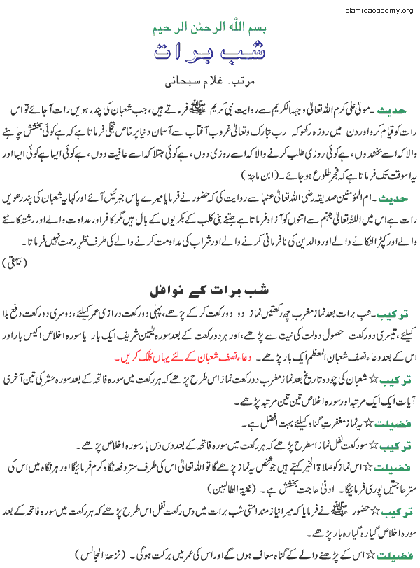 Abu Baker Al Sideeq (radiullaho anho) says that the Messenger of Allah (sallAllaahu alayhi wa sallam) said:‘’ Spend the Night of Baraat in offering nafl Prayers and observe the fast on the fifteenth day. Without doubt it is a night full of blessings and excellence. Allah Almighty proclaims on the night ‘‘Is there anyone who is desirous of peace and security that l may grant him peace and safety? Is there anyone who seeks sustenance that l may grant him sustenance? Is there anyone who seeks this and this, that l may grant him that? This proclamation and beneficence continue until the break of dawn.’’
