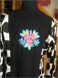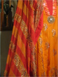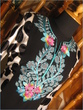 the pink and black tie and dyed pure crinkle chiffon shirt and dupatta have kaliyan and flair in it. with pink trousers. zardozi work along with swarovski crystals is done on the shirt. shirt is fully lined.$195