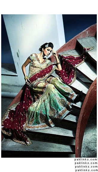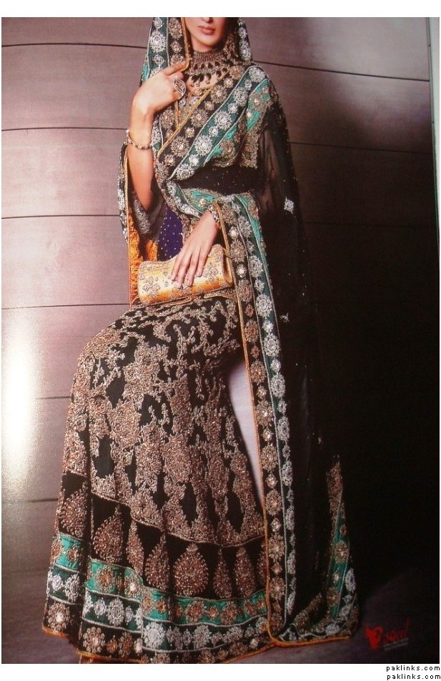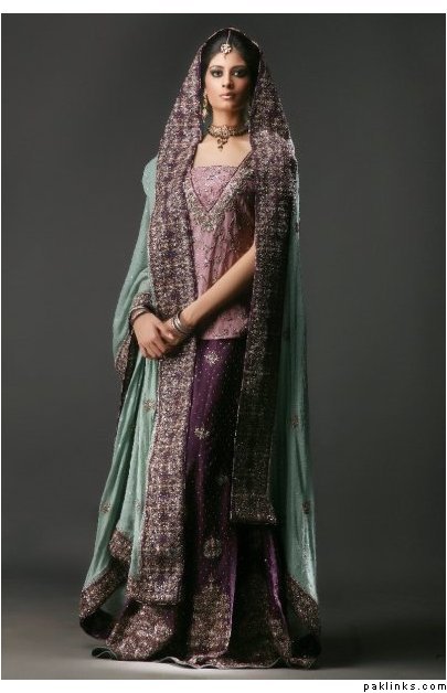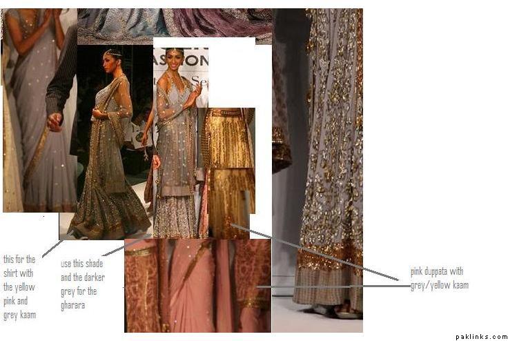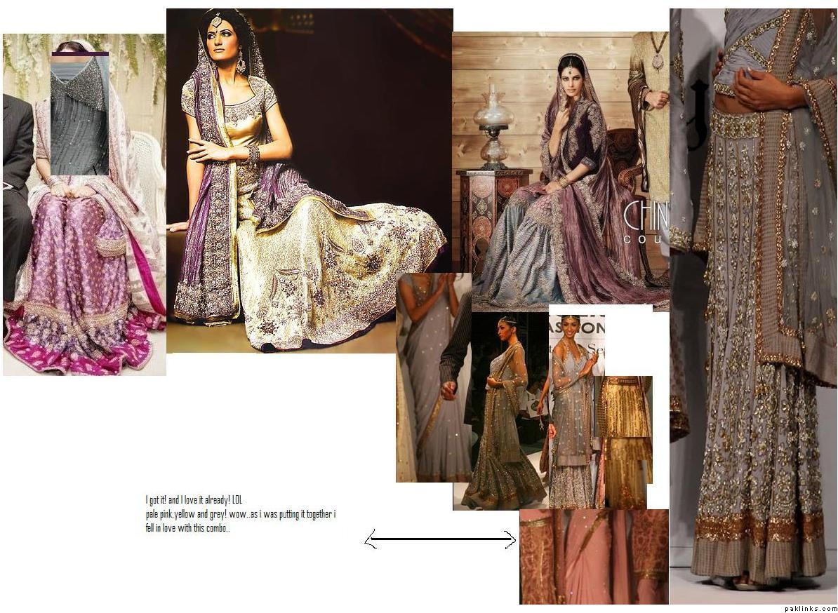 i’m sort of leaning towards an all pearly grey gharara with pearls, those little diamantes, silver/dull gold kaam, and then just work the turqoise and plum in with piping? like the Karma devi bridal- http://karma.collection.pk/product_info.php?products_id=124