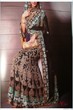 a) sari with the chinyere combo, a sleeveless deep eggplant velvet blouse with a chiffon grey and purple two toned sari..(antique gold work).