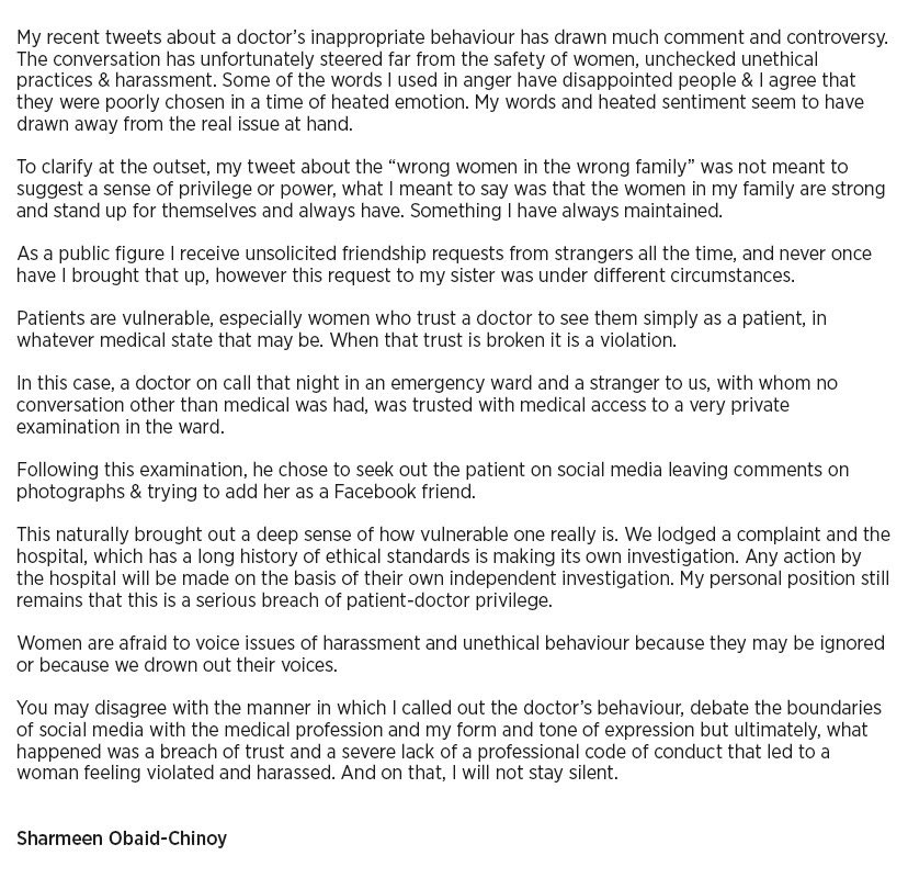 I think the whole thing is blown out of proportion. And the culprit is Sharmeen Obaid herself. Her sister felt her privacy is violated, the complain was lodged with the hospital, that should be it. Why use your "celebrity" status to broadcast around the world and cause a havoc.