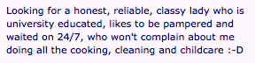 If any guy here is willing to change nappies, cook, clean, and iron let me know. And oh you gotta clean the bathrooms too.