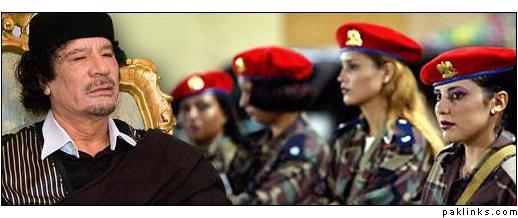 "Gaddafi's choice of bodyguards has been the subject of much media attention. His 40-member bodyguard contingent, known as the Amazonian Guard, is entirely female. All women who qualify for duty supposedly must be virgins, and are hand-picked by Gaddafi himself. They are trained in the use of firearms and martial arts at a special academy before entering service"