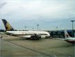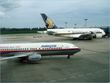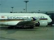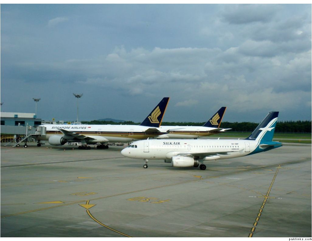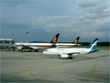 SilkAir Airbus A319 heads to the terminal in the backdrop of two Singapore Air Boeing 777-200/ER planes.