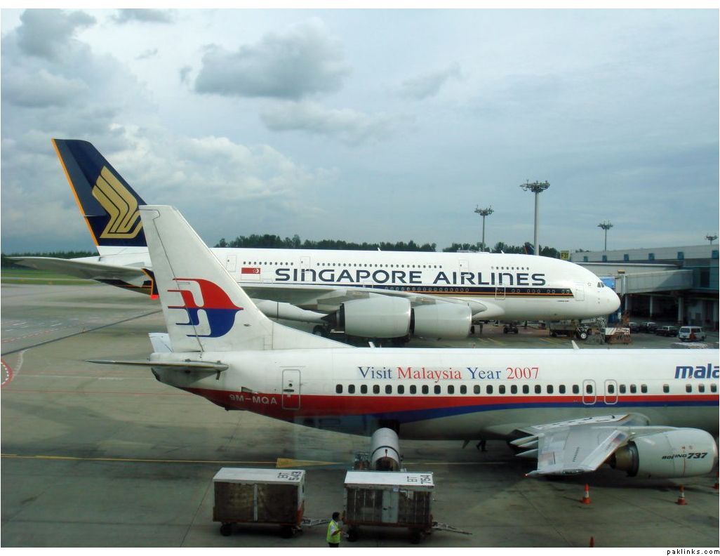 SilkAir Airbus A319 approaching the terminal while Singapore Air Airbus A340-500 gets ready to take off.
