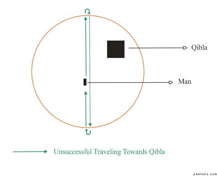 Same result: He cannot reach Qibla while travelling in any other direction (in a straight line) except the above two cases.