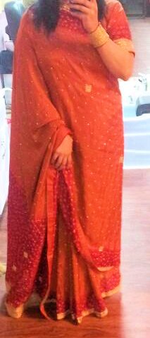 That is a pretty sari! The blouse starts to look strange if its loose. The blouse I am wearing in the orange sari was loose and I didn’t like the way it felt. I suggest, solid, fitted blouses that are a bit longer. Just make sure your sari is opaque and pinned in all the right places so no one can tell. I heart saris too ![]()