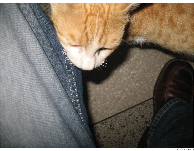 Some kids from the street I am guessing...the cat's only fault is that he's not shy at all..I often see neighbor kids testing his stretchability while he sits unmoved in their laps :(