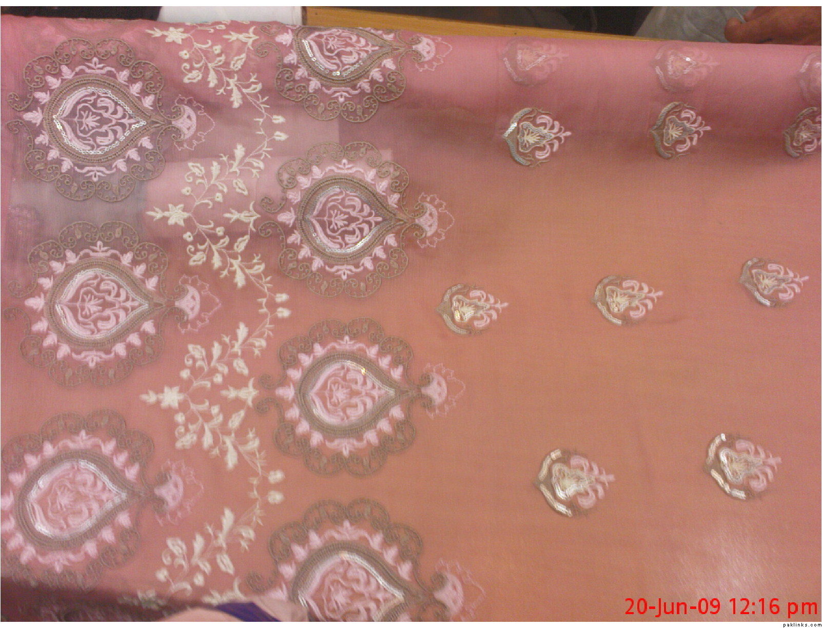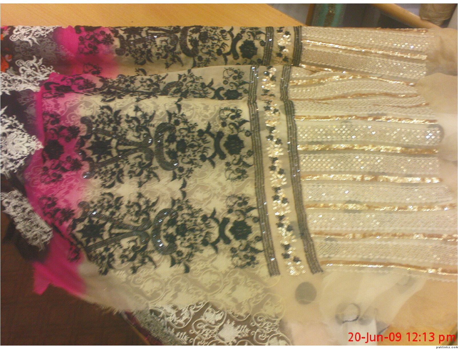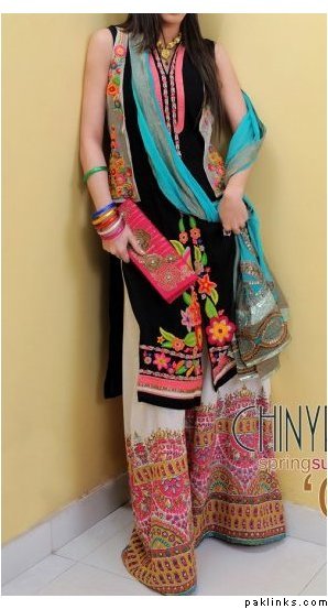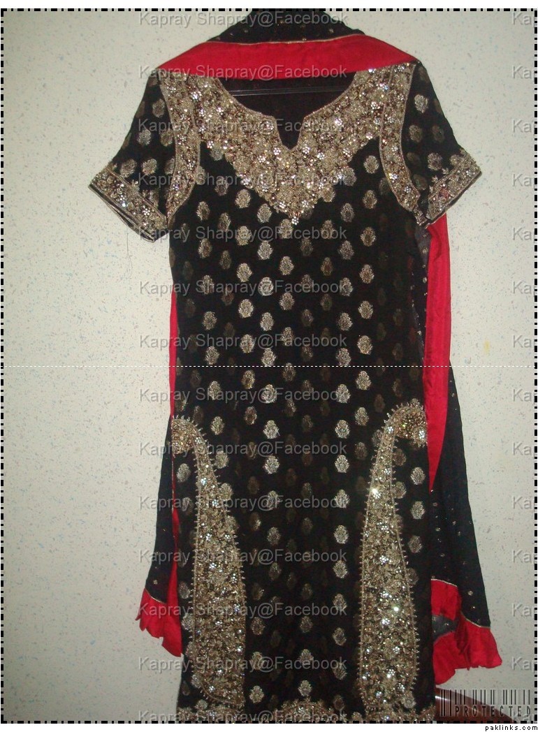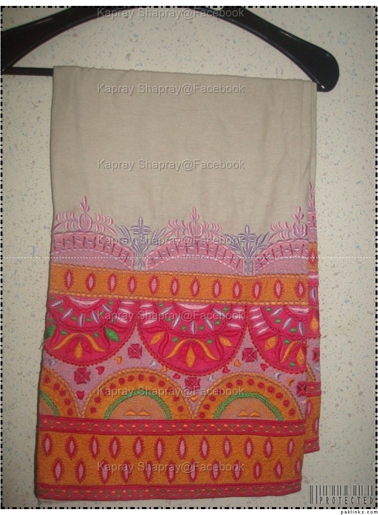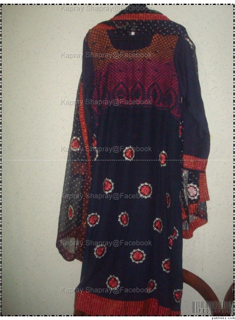embroidered k a r a n d i suit with embroidered chiffon dupatta and a hand knotted crochet top. 4500rs