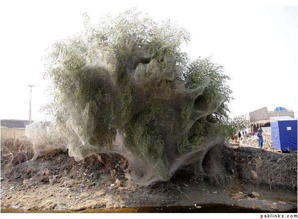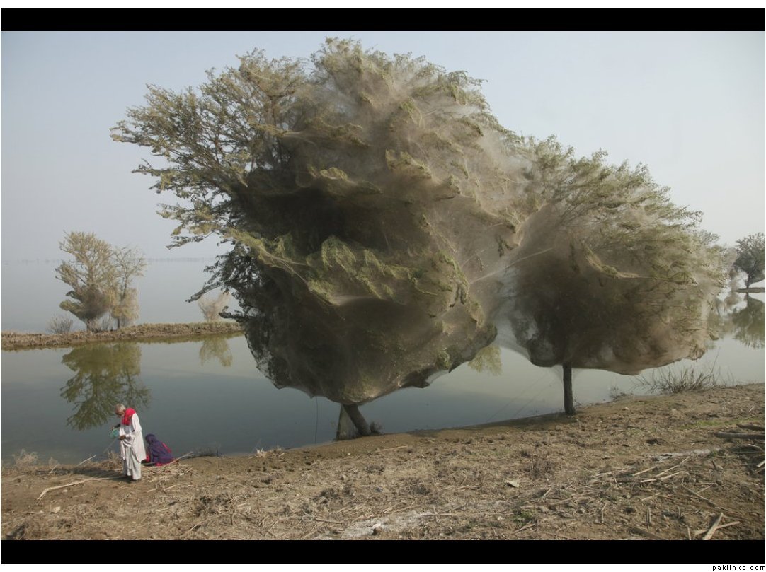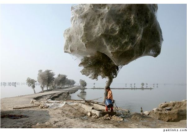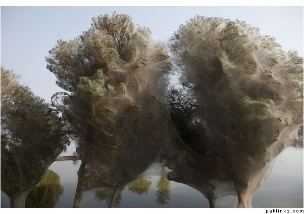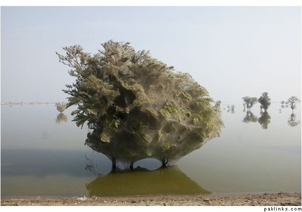 Trees Cocooned in Spider Webs After Flood in Pakistan
