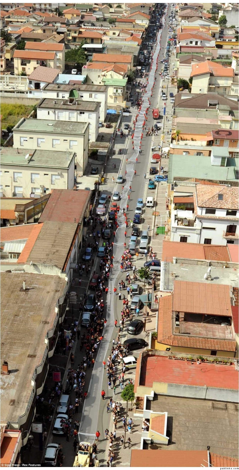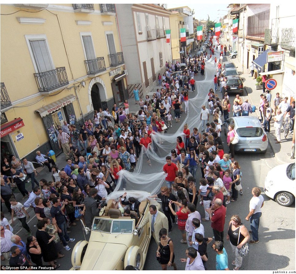 They say it’s a day you should never forget – and that’s certainly the case for Italian bride Elena De Angelis and the village of Casal di Princice. She has broken the world record for the longest wedding dress by arriving to the church with a mammoth, 3km (1.86 mile) long veil. Elena is sitting in the vintage car as hundreds of people come out to help her carry the dress through the streets of Casal di Princice Hundreds of schoolgirls and their mothers turned out to help the bride-to-be along the streets of her village.