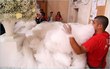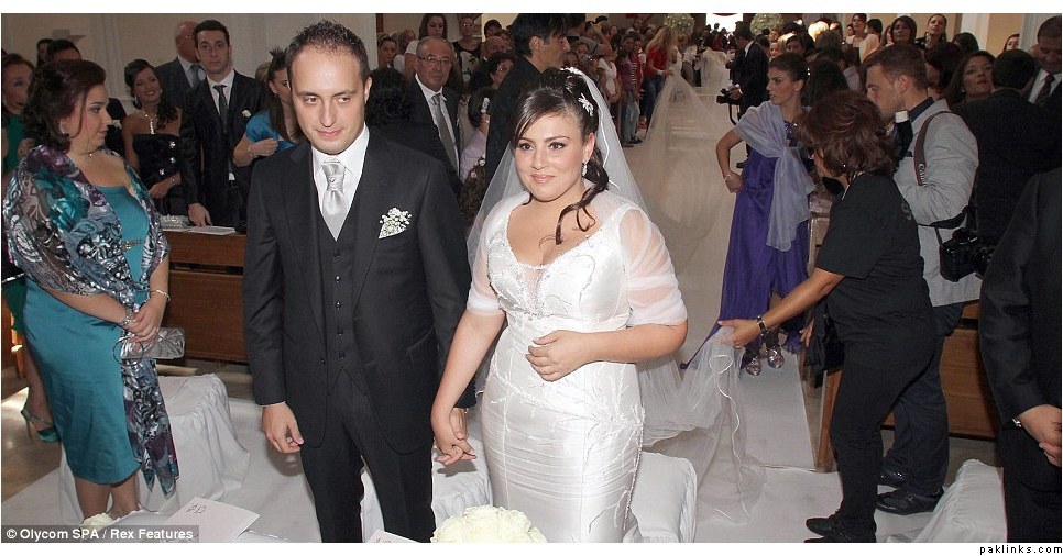 The Gianni Molaro designed cream dress, which is made from 6,000 metres of silk chord, is expected to be confirmed as the world’s longest by the Guinness book of Records. It’s apparently 28 times the length of Manchester United’s Old Trafford pitch and would take Usain Bolt running at blistering world recording pace almost five minutes to run its full length. Driven to the church in a vintage car Elena was applauded by the entire village.