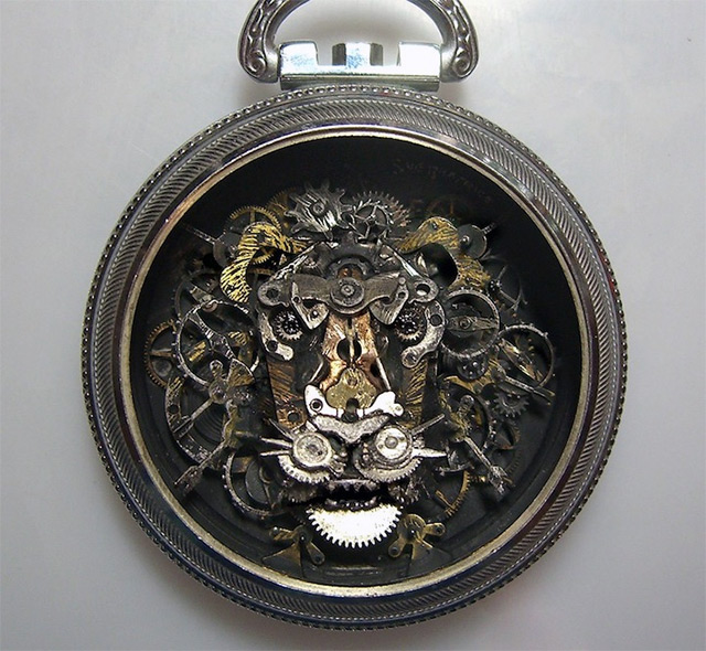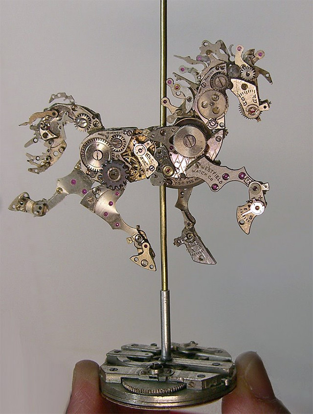 Using the smallest components from repurposed antique pocket watches and other time pieces, New-Jersey based artist Sue Beatrice of All Natural Arts assembles curious sculptures of animals and human figures.