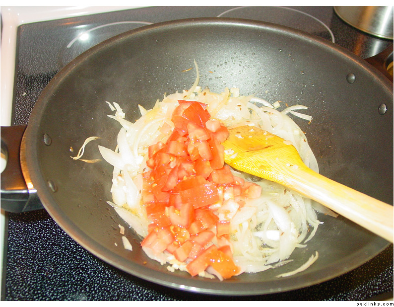Add 1 and 1/2 chopped tomatoes to onions.