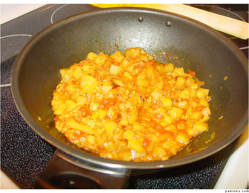 Add salt, red chilli powder to taste, and 1 tsp. haldi. Fry for a minute.