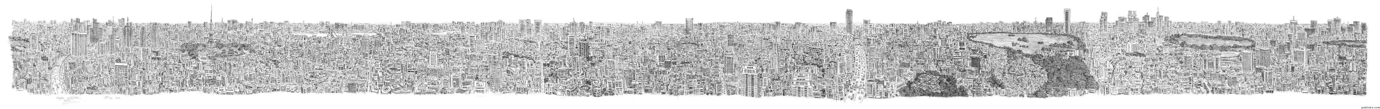 In May 2005 following a short helicopter ride over TOKYO he drew a stunningly detailed panoramic view of the city on a 10-meter-long canvas. Since then he has drawn ROME, HONG KONG and FRANKFURT on giant canvasses.
