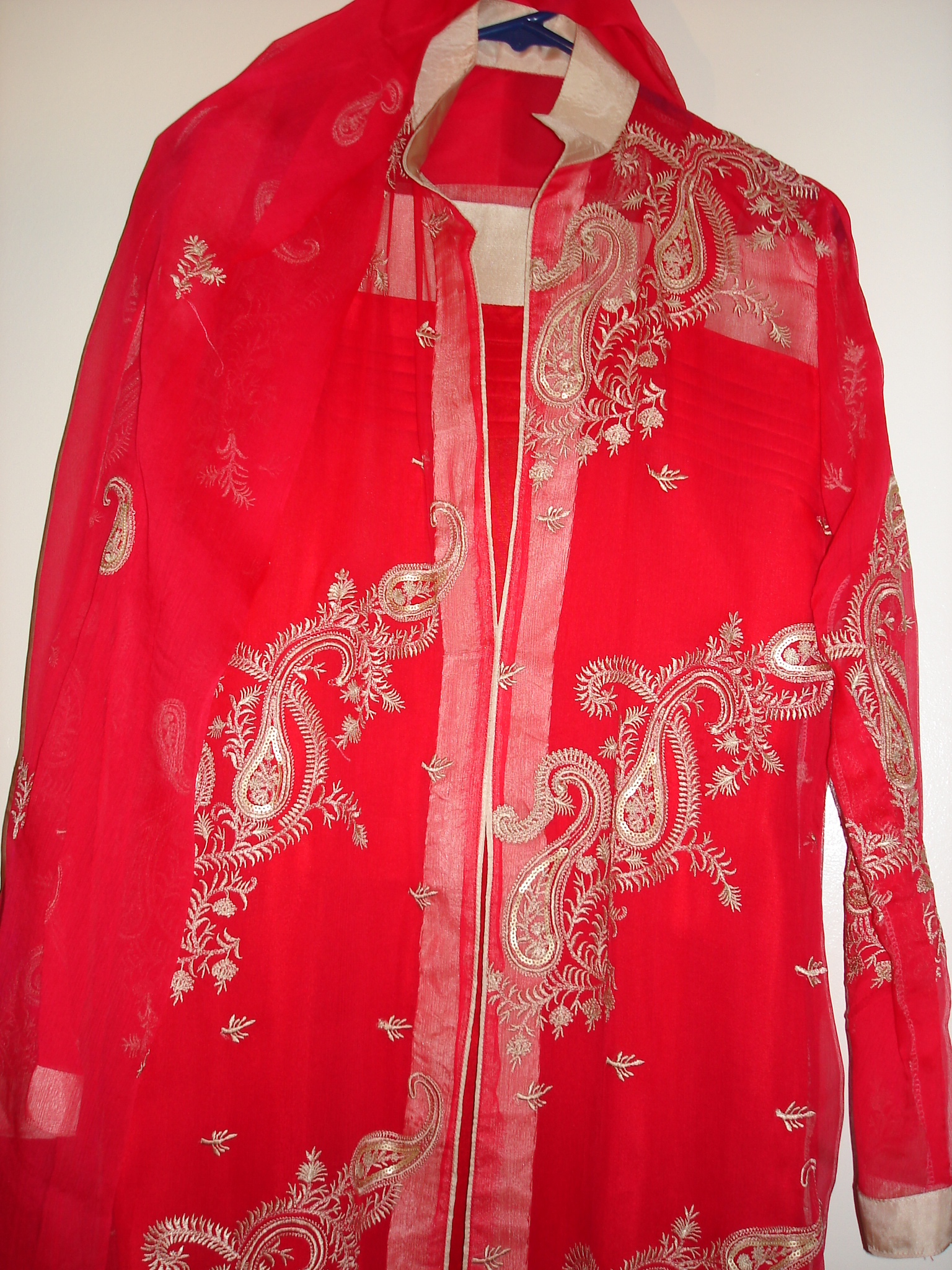 Its beautiful cherry red chiffon cardigan and duppata with beige thread work and sequins. The top is red too and trouser is in beige raw silk.