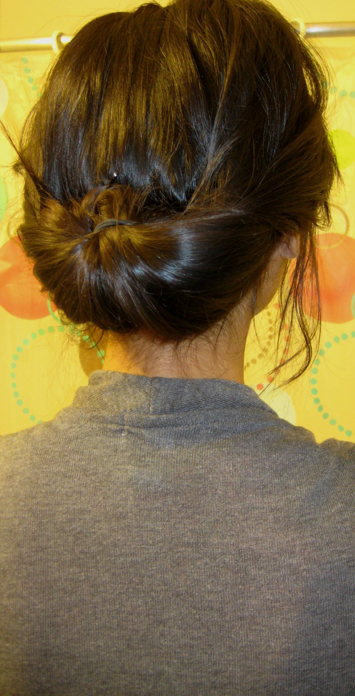 make a ponytail, pull it up and roll it up. Make a pocket right before the ponytail begins and tuck the tail in there, secure it with hair pins.. use an elastic thats not so visible, unlike mine.