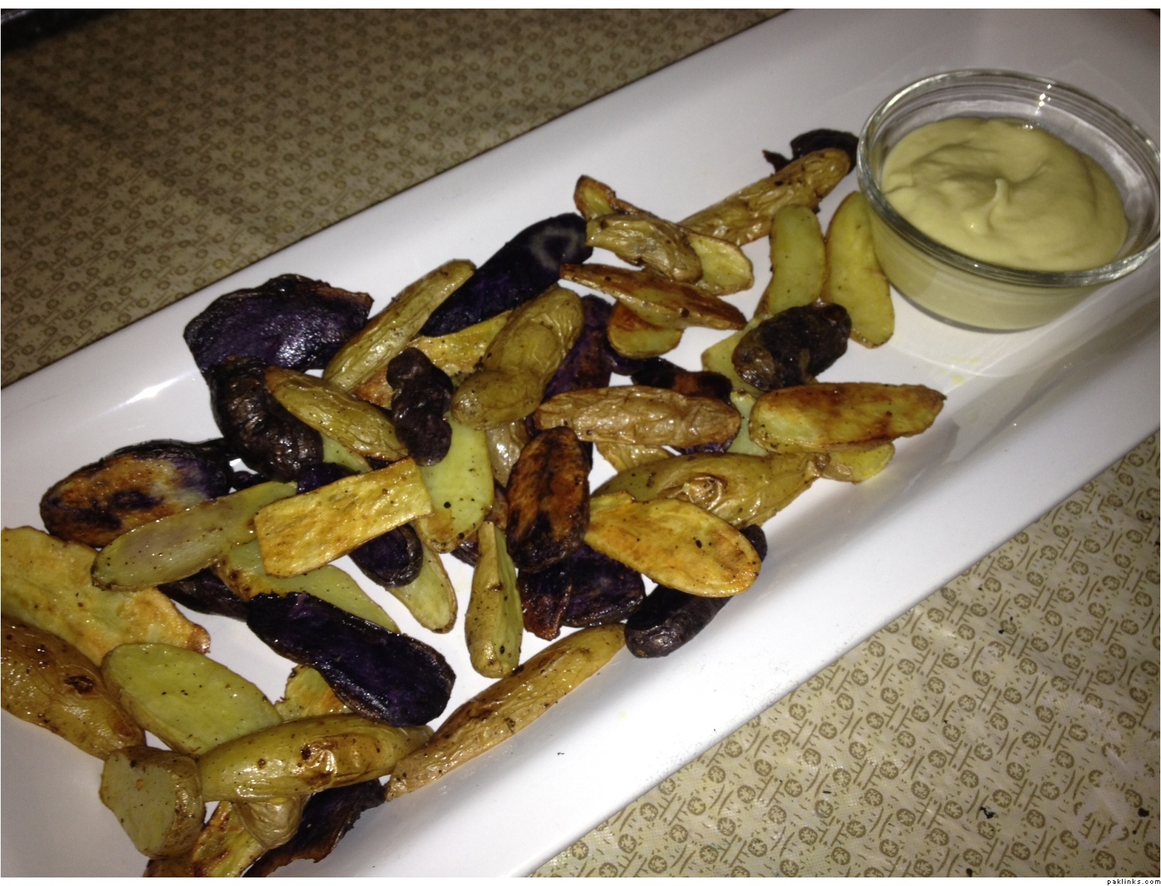 roasted fingerling potato wedges (purple potatos too!) with Al Baik style garlic sauce