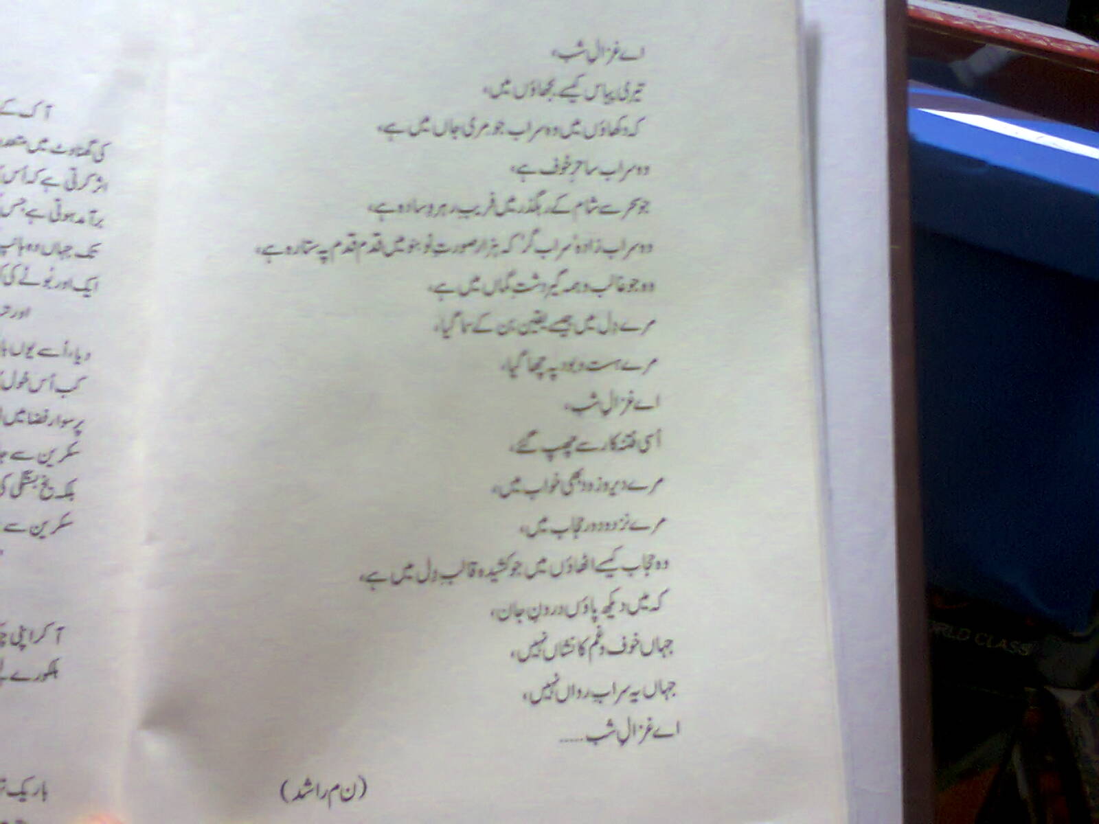 Reading Mustansar Hussain TaraR’s ‘Ae Ghizal e shab’. The name is taken from Noon Meem Rashid’s poem, beautifully sung by Nayyara Noor.
