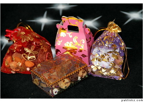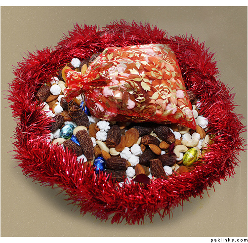 Traditionally, bidh packets include chuaara (dried date), misri (crystallized sugar lumps), soonf (supaari), kishmish (raisin), badaam (almonds), makhaanay (the round white ball made of sugar), and a toffee.