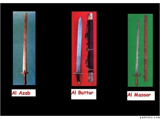 al-'Azab, the name of this sword, means “cutting” or “sharp.” This sword was sent to the prophet Muhammad by one of his companions just before the Battle of Badr. He used this sword at the Battle of Uhud and his followers used it to demonstrate their fealty to him.