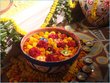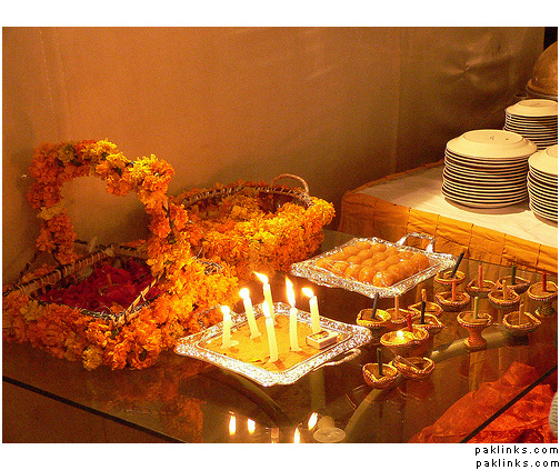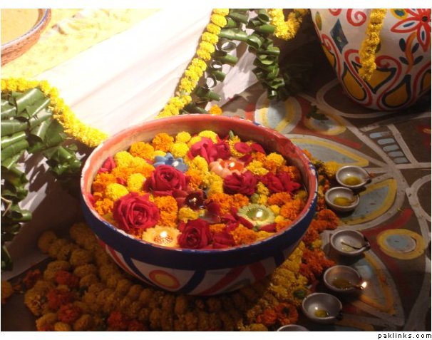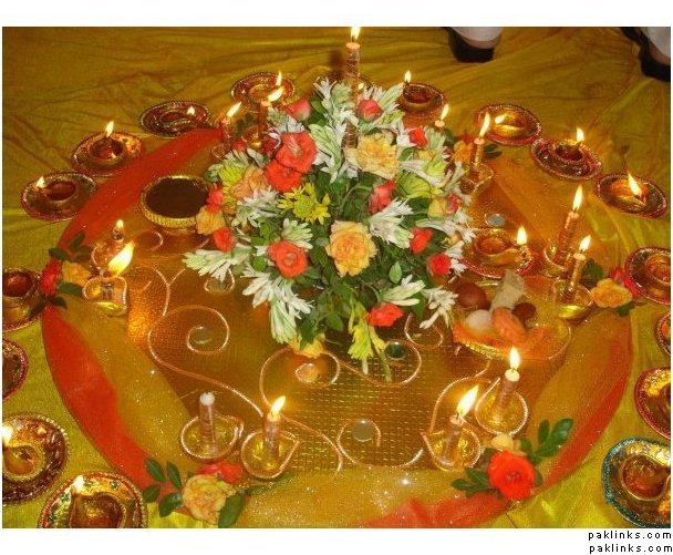 thanks everyone for the great pictures. for the mehndi thinking candles and colours yellow, red, green...traditional colours. For the barat not sure really, im wearing red and green gharara but dnt know if to have red in the color scheme or just stick to creams and golds. The thing is dont want it to be too expensive, but also what are we going to do with 30 fish bowels at the end of the function.