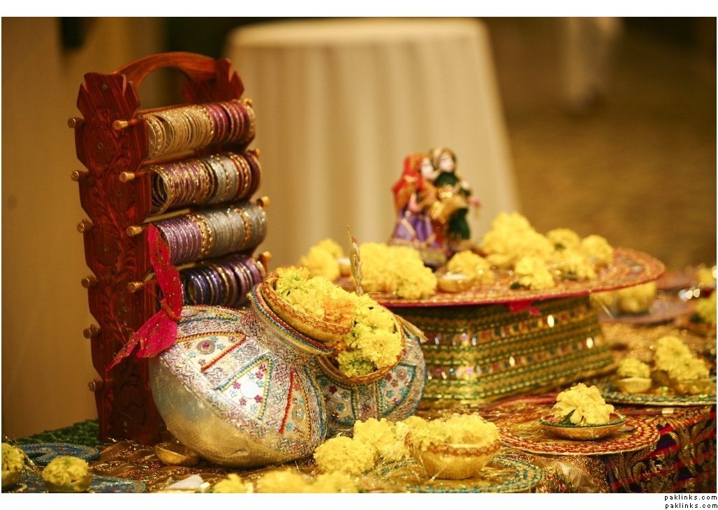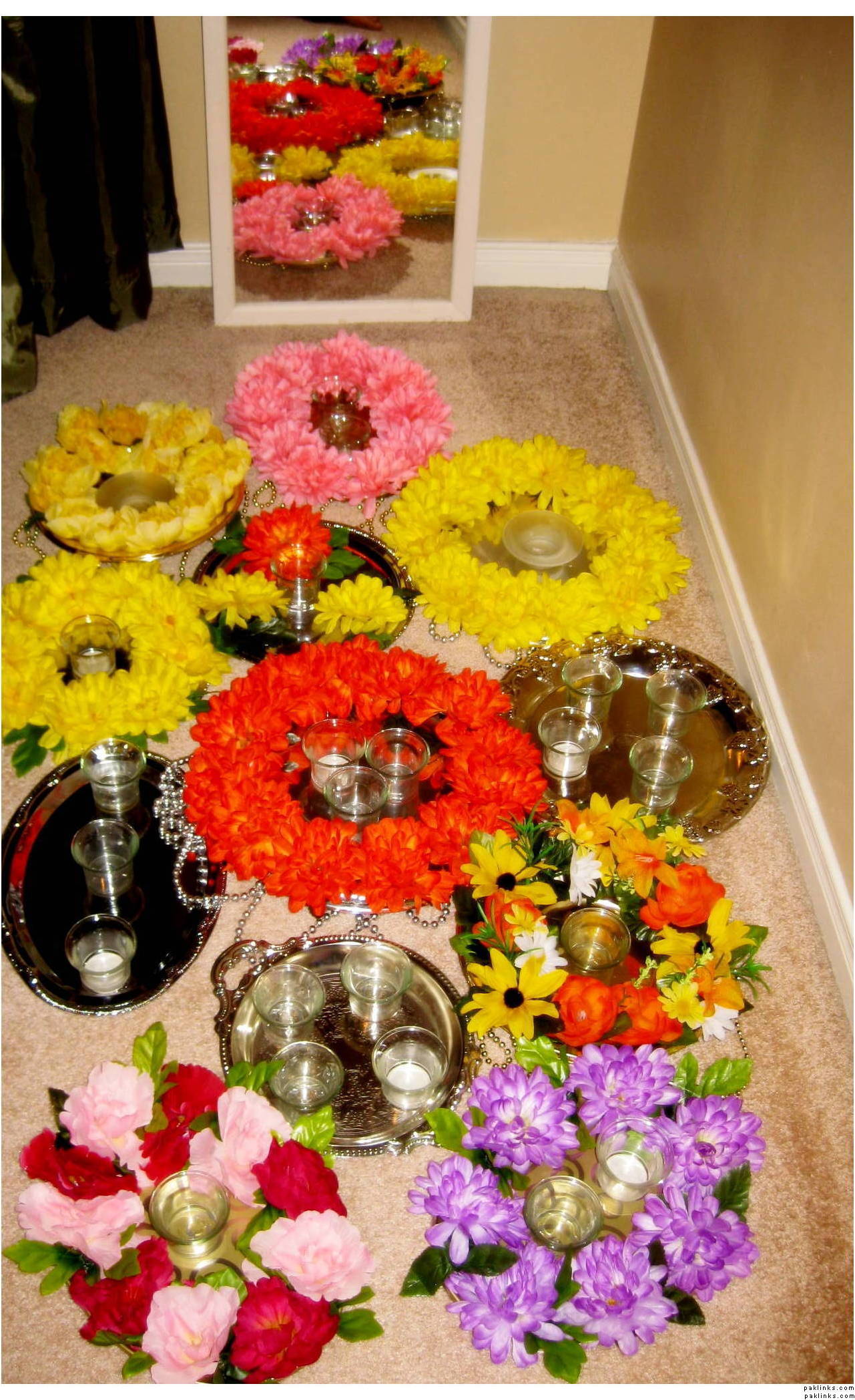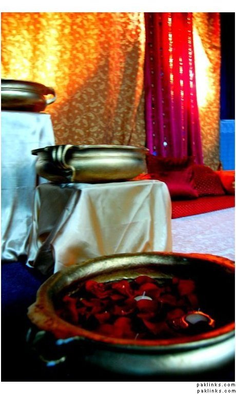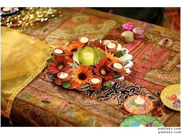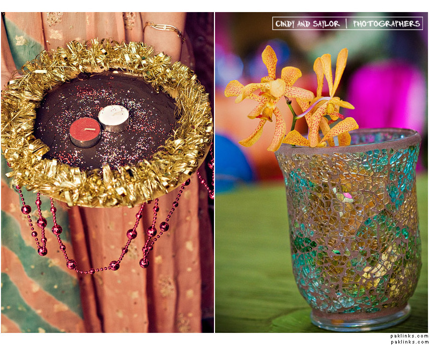 For the mehndi, i think if you can get wide, glass bowls, put floating candles and the heads of gerber daisies in water in those bowls. It looks really pretty, and is not too expensive.