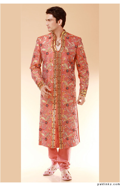As for sherwanis, the same embroidery issues apply. These are the first two sherwanis that popped up at an online Indian clothing store…they’re not cheap (~$600), but they’re plenty gaudy. Also, notice the turban that looks so fake you’d think it was molded from plastic.