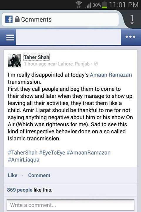 ok Sajal. There are two parties involved here. If this is the case, some responsibility is on Tahir Shah’s shoulders too. If Aamir has no sense, then Tahir should have used his own brain and thought better of what he was doing. If Aamir asked him to sing the vulgar song, Tahir could and should have said NO and chose to sing a more appropriate song. I do not believe anybody on that show is forced to do anything against their will - otherwise he would be crying about this too on his FB page.
