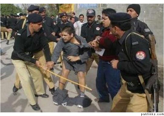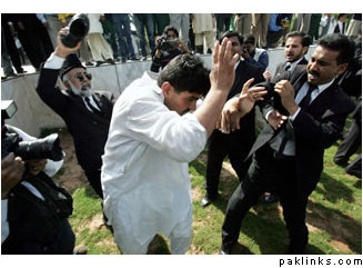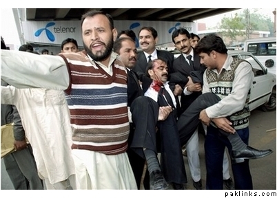 Pakistani Lawyers beating pro-government lawyers. Later the hapless pro-government lawyers were rescued but the poor souls had lost their clothes and their dignity.