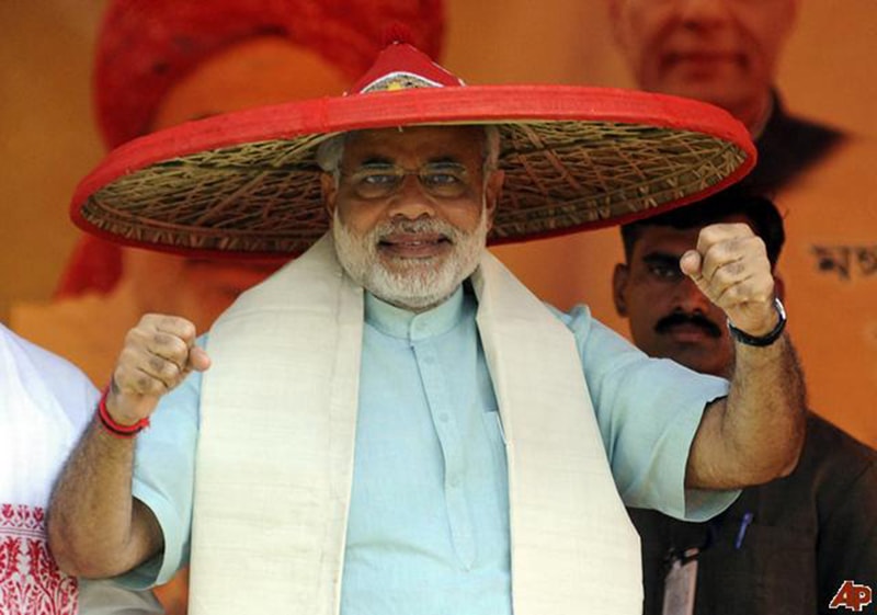 PM Modi proudly exhibits a hat specially designed to ward off attacks by Pakistani pigeons from the air …
