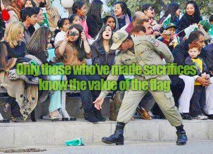 dion k taqaddus ka bhi khayal rakhain.... agr aap watan ko maa kehtay haina.. to yeh jhanda maa k sir ki chaadar hai.... maa k sir ki chaadar koi paon me nhi rondhta... na sarkon aur galion me phainkta hai..... agr aapko aise nzr aajayen to utha kr oonchi aur mehfooz jaga pr rakh dain........... jazak ALLAH