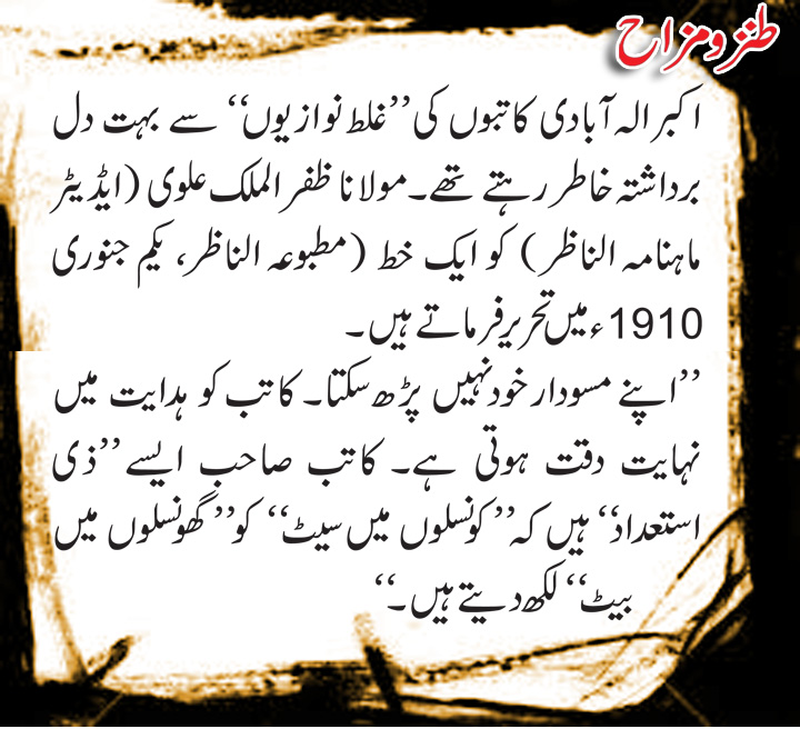 [RIGHT]اکبر الہٰ آبادی کاتبوں کی ’’غلط نوازیوں‘‘ سے بہت دل برداشتہ خاطر رہتے تھے۔ مولانا ظفر الملک علوی (ایڈیٹر ماہنامہ الناظر) کو ایک خط (مطبوعہ الناظر، یکم جنوری ۱۹۱۰ میں تحریر فرماتے ہیں۔