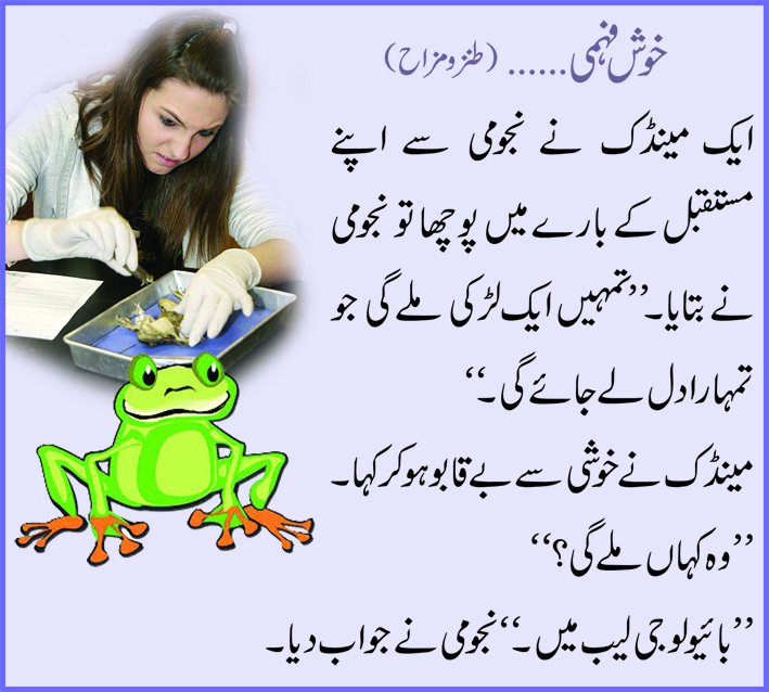 ایک مینڈک نے نجومی سے اپنے مستقبل کے بارے میں پوچھا تو نجومی نے بتایا۔ ’’تمہیں ایک لڑکی ملے گی جو تمہارا دل لے جائے گی۔‘‘
