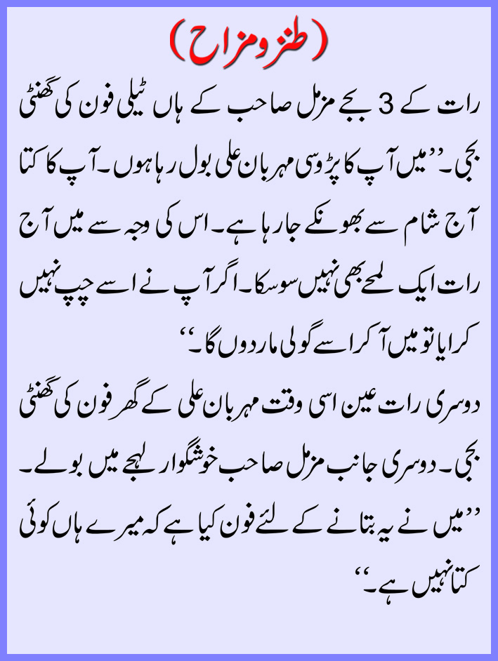 رات کے ۳ بجے مزمل صاحب کے ہاں ٹیلی فون کی گھنٹی بجی۔ ’’میں آپ کا پڑوسی مہربان علی بول رہا ہوں۔ آپ کا کتا آج شام سے بھونکے جارہا ہے۔ اس کی وجہ سے میں آج رات ایک لمحے بھی نہیں سوسکا۔ اگر آپ نے اسے چپ نہیں کرایا تو میں آکر اسے گولی ماردوں گا۔‘‘