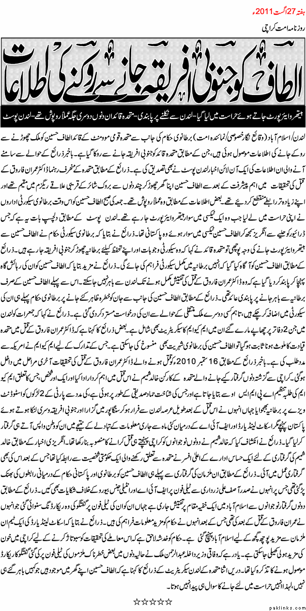 Some of my friends told me that they didn't get today's newpapers as the MQM ppl confiscated newspapers from hawkers due to Reports in respect of recent development in Imran Farooq's case.
