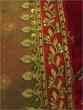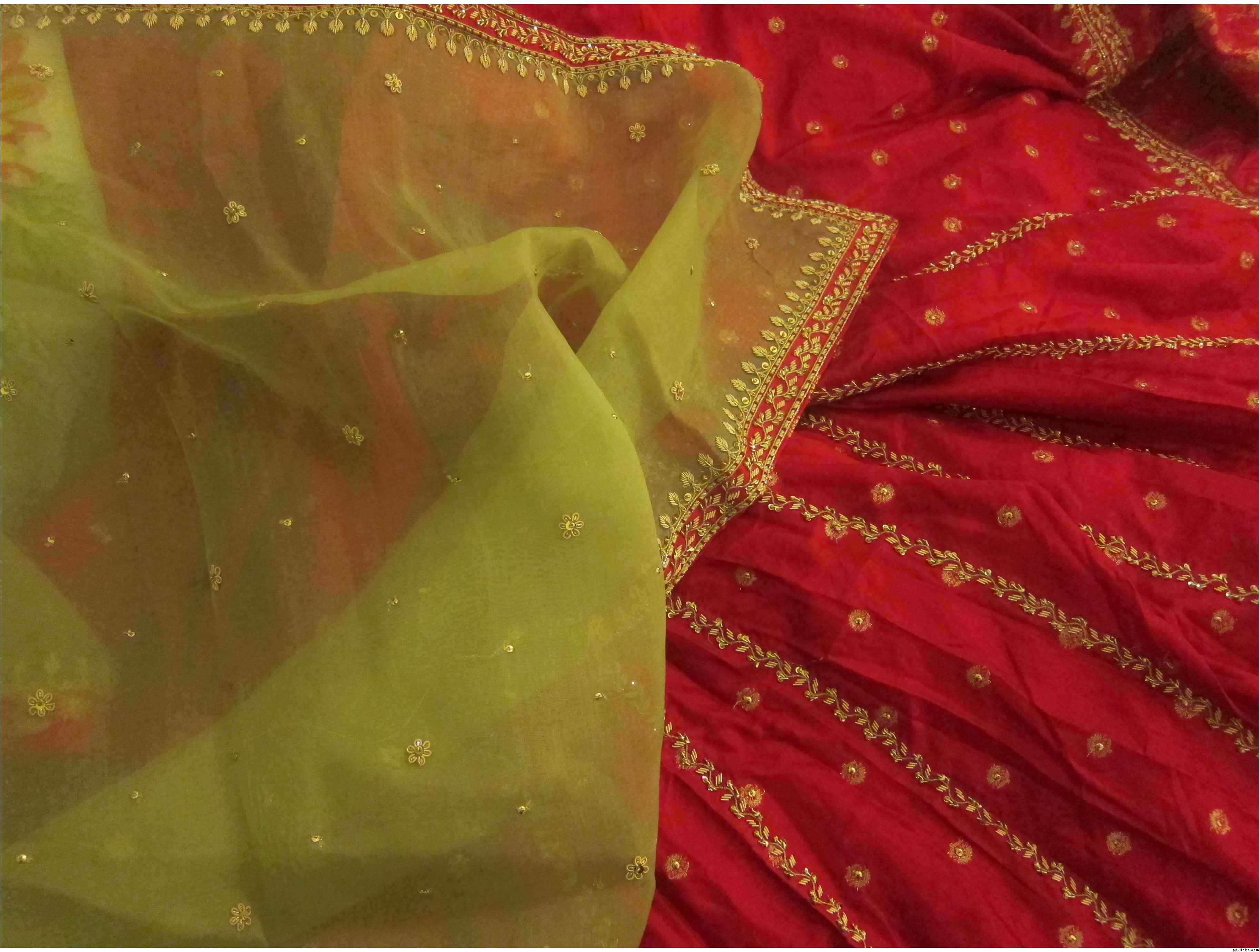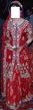 It was a long open shirt in deep red and had silver, gold and champagne color kaam all over, with purple banarsi patti. Shirt and dopatta was crincle chiffon and lehnga was printed banarsi.