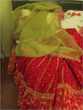 It was a frock with body in hot pinkish maroon shade and rest was olive green. Dopatta was yellow with patti of the body wala kapra. The frock was short in the front and long on the back and had gota kaam all around its border. Chooridaar was also green and sleeves were puff sleeves ![]()