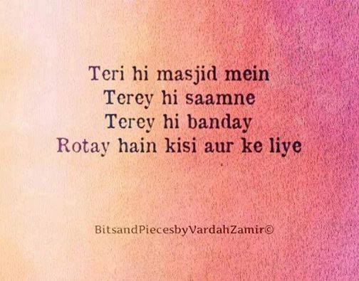 uski raza ko chor kr apni raza? usky khauf or uski Muhabbat ky liya ansoo na baha kr kisi or shakhs ky liya ansoo bhana. bohat kam log hi hain is dunya main jo Khauf-e-Ilahii or Muhabbat-e-Ilahii main ansoo bhaty hain.