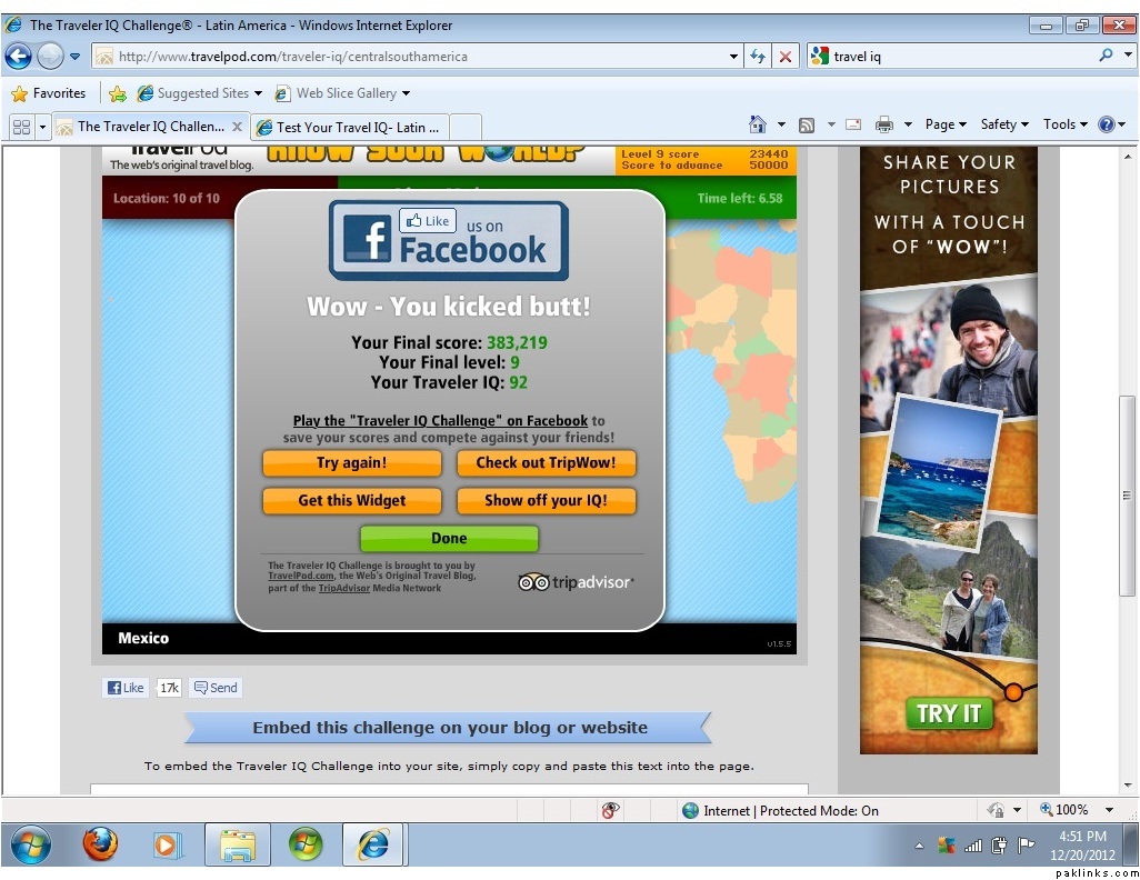 **Alright my travel savvy guppans! It’s that time again! Get your thinking caps on and let’s see how well you know…LATIN AMERICA!!! Post your scores/level reached, and let’s see if Umer ****can keep his place as champ!!! ****estás listo? establecer? vamos a ir!