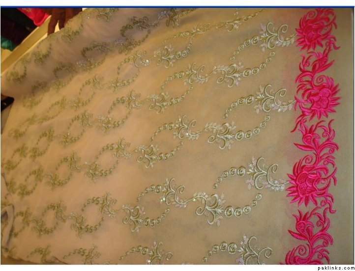 Maybe a kind of anarkali with the pink design as border. And some pink karhai on the neck With a pink chooridar