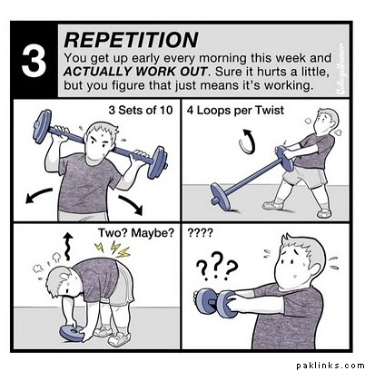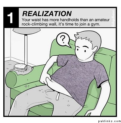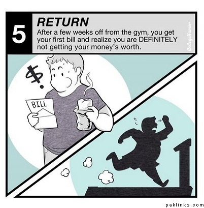 **The 7 Stages of Going to the Gym’ where discovery (that you’re fat) in stage one eventually leads you right back to the first stage… where you’re still fat.