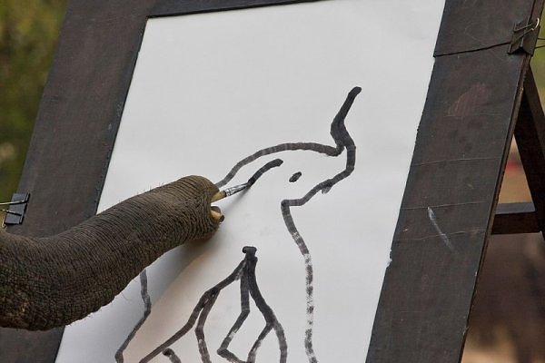 The art class starts serenely. Standing poised before its easel, the creature’s tail swishes and ears gently flap. Then, brush held in the tip of its trunk, this most imposing of land mammals deftly drags a streak of paint across the page. At first the sense of awe limits itself to the dexterity at work, but as the seemingly arbitrary squiggle takes on the likeness of the creature itself, wonder fills the air in gasps of “Oh my goodness!” from the watching American tourists. Art has arrived in the animal kingdom.