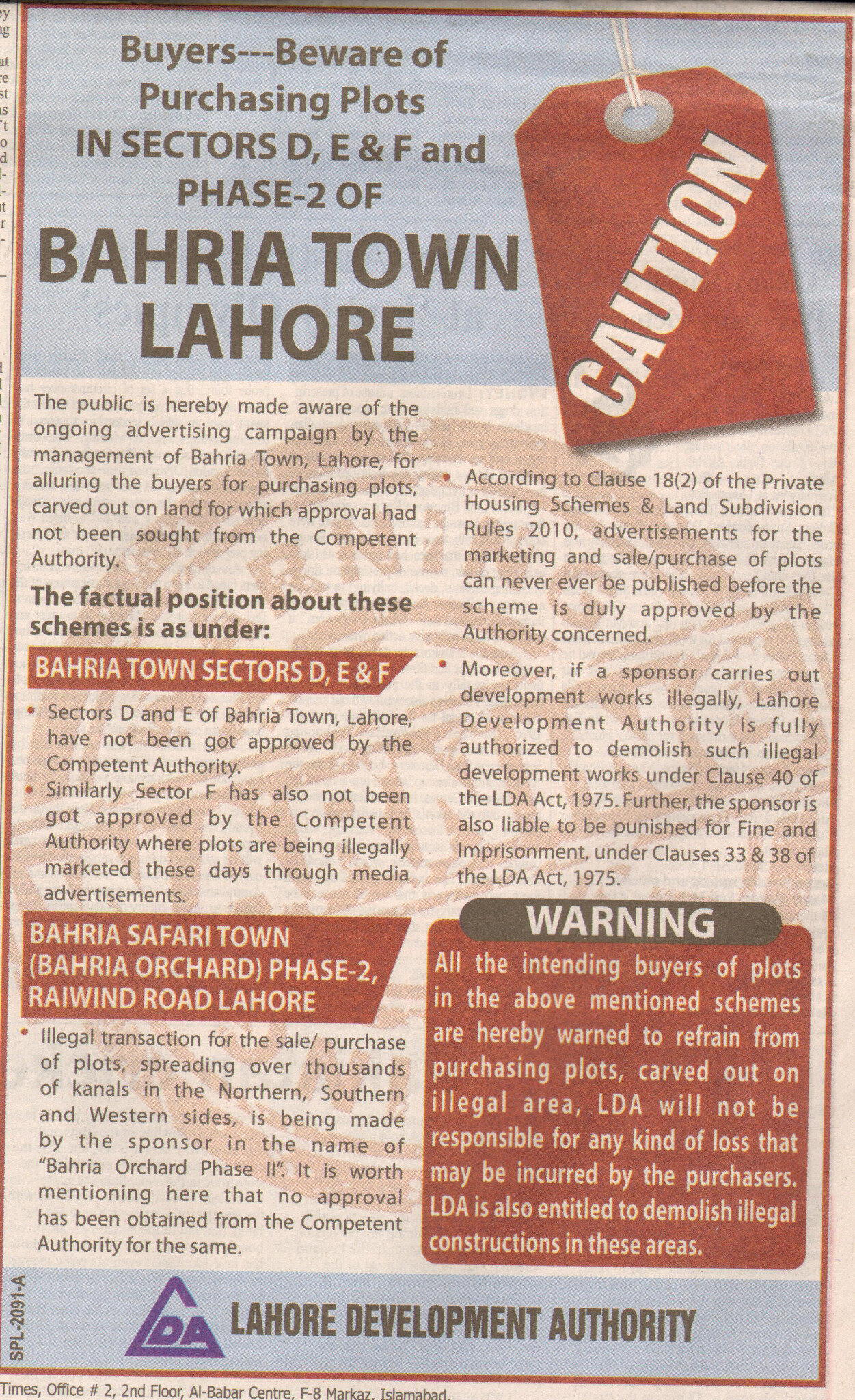 Instead of printing out an ad on a newspaper which many people may not read, why doesn’t LDA get management of Bahria Town arrested or take them to court?