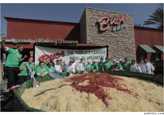 Spaghetti is truly the food of love - just ask Lady and the Tramp - but it would take a big dog indeed to wolf its way through this enormous portion. Created by Italian eatery Buca di Beppo, weighing 13,786 pounds (6,245 kg) and served in a bowl measuring 15 ft wide, this is another California record breaker. Mamma mia!